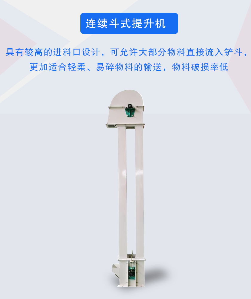 連續(xù)斗式提升機(jī)簡(jiǎn)稱(chēng)連續(xù)式提升機(jī),是利用料斗和牽引件進(jìn)行物料輸送的設(shè)備,連續(xù)斗式提升機(jī)采用比較慢的速度運(yùn)行,具有較高的進(jìn)料口設(shè)計(jì),可允許大部分物料直接流入鏟斗,更加適合輕柔、易碎物料的輸送,物料破損率低,對(duì)于較大和較重的塊狀物和高磨蝕性材料也是理想的選擇,根據(jù)牽引件的不同主要分為鏈條式和皮帶式兩種。