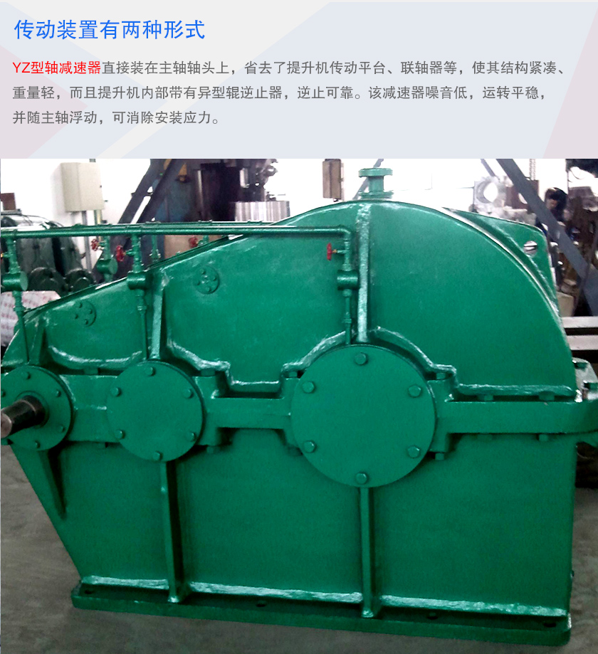 傳動(dòng)裝置有兩種形式,分別配有YZ型減速器、ZQ(或YY)型減速器。YZ型軸減速器直接裝在主軸軸頭上,省去了提升機(jī)傳動(dòng)平臺(tái)、聯(lián)軸器等,使其結(jié)構(gòu)緊湊、重量輕,而且提升機(jī)內(nèi)部帶有異型輥逆止器,逆止可靠。該減速器噪音低,運(yùn)轉(zhuǎn)平穩(wěn),并隨主軸浮動(dòng),可消除安裝應(yīng)力。ZQ型減速器工作環(huán)境溫度為-40℃到+40℃,轉(zhuǎn)速不大于1500轉(zhuǎn)/分,齒輪傳動(dòng)圓周速度不大于10米/秒,此種類(lèi)型的減速器強(qiáng)度高,齒面磨損小,使用壽命長(zhǎng)。