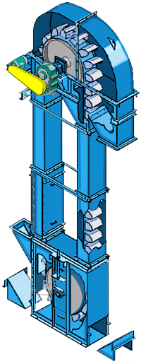 連續(xù)斗式提升機(jī)主要由傳動(dòng)裝置、牽引裝置(環(huán)鏈、板鏈或膠帶)、承載裝置(料斗)、張緊裝置、制動(dòng)裝置、機(jī)殼(進(jìn)料口、出料口、中間殼體)組成。