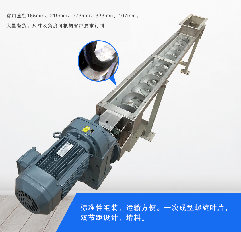 粉煤灰螺旋輸送機(jī)常用直徑有165mm、219mm、273mm、323mm、407mm,可選萬(wàn)向球連接以及軟布袋連接兩種連接方式,使安裝調(diào)節(jié)轉(zhuǎn)向方便,連接更嚴(yán)密。密封性好,能防止粉塵污染,可根據(jù)用戶輸送工藝水平或傾斜輸送,組合靈活,可與多種設(shè)備配套使用。