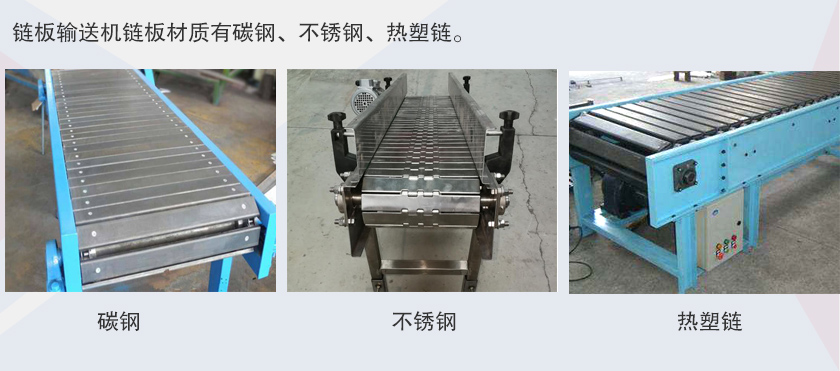鏈板式輸送機是利用固接在牽引鏈上的一系列鏈條提供牽引力,用金屬板做為承載體使物料在水平或傾斜方向上輸送。