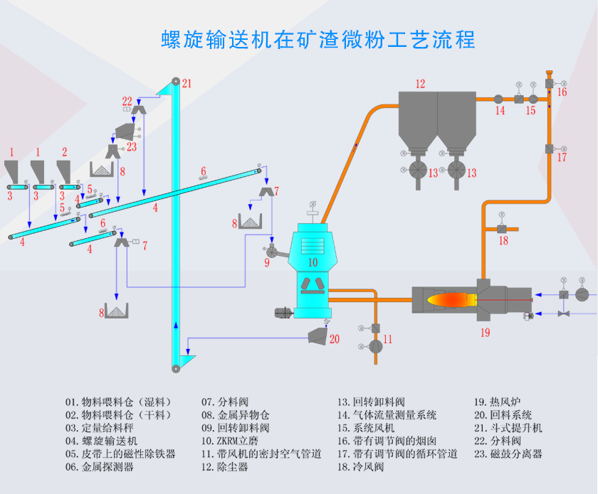 螺旋輸送機在礦渣微粉工藝流程中起著重要的作用。以下是一般情況下螺旋輸送機在礦渣微粉工藝流程中的應用過程: