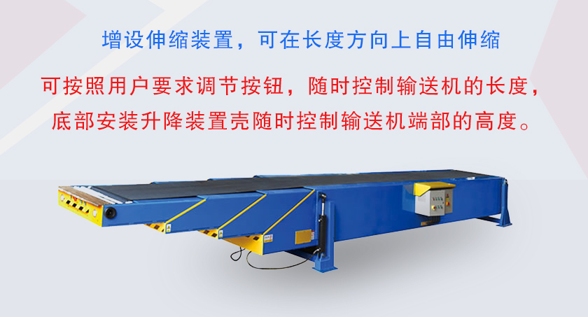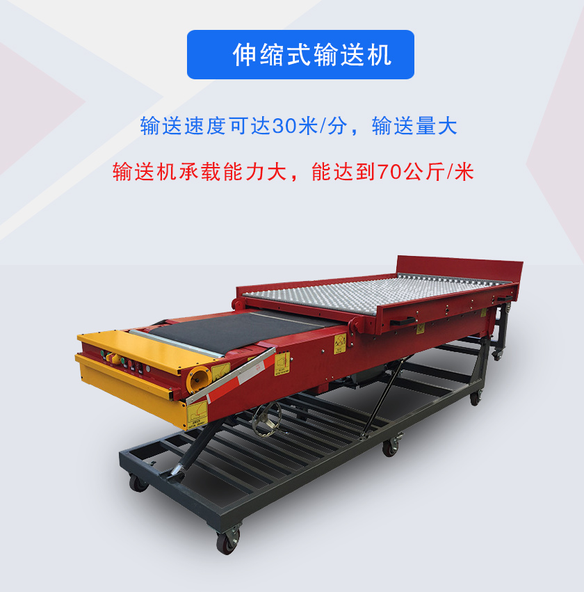 伸縮式輸送機即伸縮式皮帶,可以根據工作面位置變化調整自身長度的輸送機,伸縮式輸送機可在長度方向上自由伸縮,自由調控輸送長度,減少了裝卸貨物的時間,降低了工人的勞動強度,可用于輸送粉狀、粒狀物料輸送.