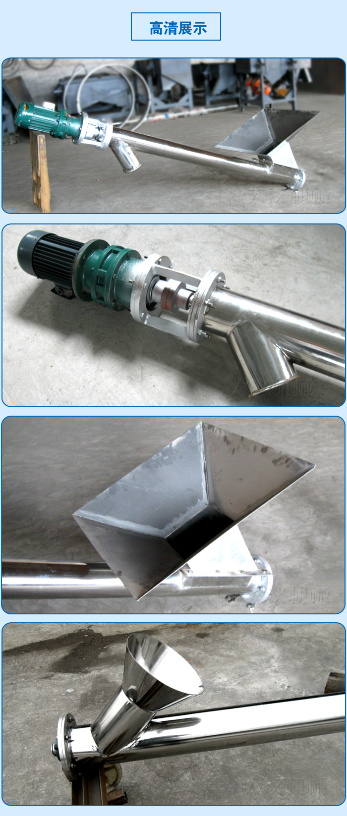 糧食螺旋輸送機主要由驅動裝置、頭部裝配、機殼、螺旋體、槽體襯板、進料口、出料口、機蓋(需要時)、底座等組成。