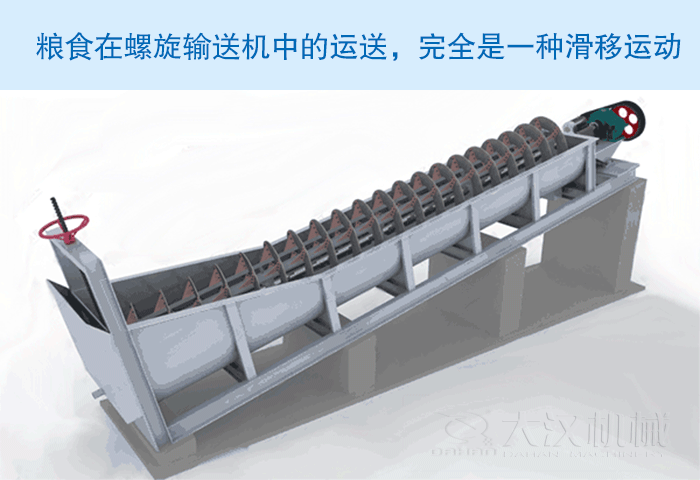 糧食螺旋輸送機是利用旋轉的螺旋葉片將糧食推移而進行輸送,使物料與螺旋葉片一起旋轉的力是物料自身重量和螺旋輸送機機殼對物料的摩擦阻力。糧食在中間軸承的運移,則是依靠后面前進著的物料的推力。所以,糧食在螺旋輸送機中的運送,完全是一種滑移運動。
