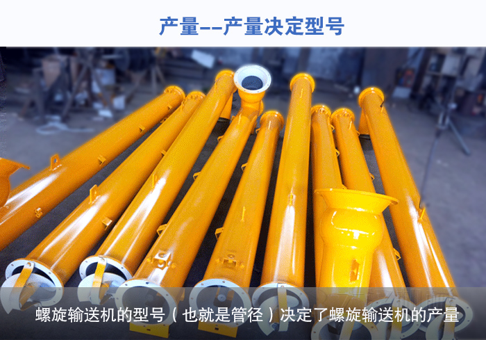 螺旋輸送機的型號(也就是管徑)決定了螺旋輸送機的產量,輸送產量越大,螺旋輸送機選擇的型號越就餓越大。