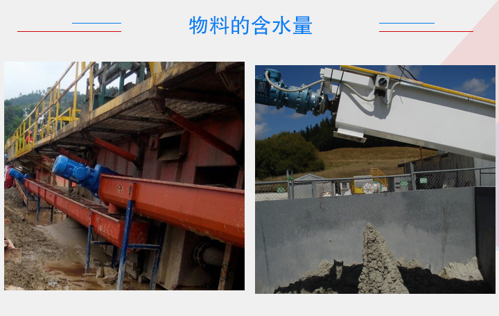 物料含水量的高低會(huì)影響螺旋輸送機(jī)輸送效率,含水量高,物料在輸送過(guò)程中極易粘附在螺旋葉片上火輸送機(jī)內(nèi)壁上,長(zhǎng)此以往,粘附在葉片和內(nèi)壁上的物料會(huì)增多,造成堵網(wǎng)現(xiàn)象,大大降低螺旋輸送機(jī)的輸送量,長(zhǎng)久黏附的物料還需要進(jìn)行人工清除。