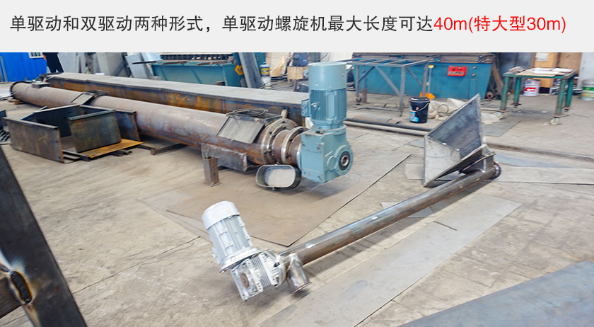 管式螺旋輸送機分為單驅動和雙驅動兩種形式,單驅動螺旋機長度可達40m(特大型30m),雙驅動螺旋機采用中間斷開軸結構,長度可達80m(特大型60m),螺旋機長度每 0.5m 一檔,可根據(jù)需要選定。
